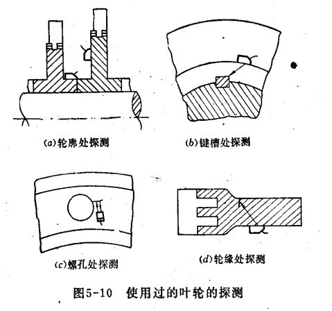 使用過(guò)的葉輪,主要是發(fā)現(xiàn)疲勞裂紋。因此探傷儀探測(cè)區(qū)域應(yīng)選擇承受應(yīng)力最大的部位,如輪殼,鍵槽,螺紋孔以及輪面與輪緣的過(guò)渡區(qū)域的截面等,如下圖示,用斜探頭在輪殼外圓上探測(cè)時(shí),可發(fā)現(xiàn)輪殼內(nèi)的徑向缺陷和鍵槽處的缺陷。當(dāng)探頭主聲束射至鍵槽時(shí),則出現(xiàn)強(qiáng)烈的鍵槽反射波,找到鍵槽反射波后,將探頭繼續(xù)向前移動(dòng),若在鍵槽反射波的附近出現(xiàn)反射波時(shí),則鍵槽處存在裂紋。