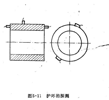 環(huán)形鍛件(如發(fā)電機(jī)護(hù)環(huán))中的缺陷具有各種方向,探測(cè)時(shí),應(yīng)由不通過(guò)方向分別用直探頭和斜探頭進(jìn)行。用直探頭在護(hù)環(huán)的外圓表面進(jìn)行周向探測(cè),以發(fā)現(xiàn)護(hù)環(huán)內(nèi)大部分缺陷,必要時(shí),還應(yīng)在端面進(jìn)行探測(cè)。為發(fā)現(xiàn)裂紋,可用斜探頭(30°,40°)從護(hù)環(huán)外圓表面作周向和軸向探測(cè),如下圖所示,使用過(guò)的護(hù)環(huán),主要用斜探頭探測(cè)其內(nèi)外表面的裂紋,對(duì)通風(fēng)孔邊緣的裂紋尚可用表面波探測(cè)。