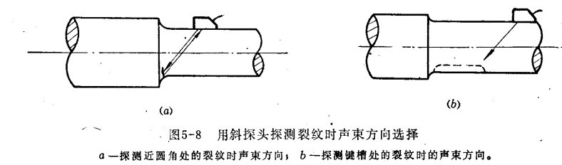 曲軸的探測(cè) 曲軸的探測(cè)以直探頭為主,一般在主軸頸、曲柄銷及扇板上進(jìn)行。必要時(shí),可用斜探頭做輔助探測(cè),如下圖1,用斜探頭探測(cè)近軸頸過(guò)度區(qū)圓角處或軸鍵槽處的裂紋時(shí),應(yīng)注意選擇聲束的入射方向,如圖2。探測(cè)時(shí)還應(yīng)注意油孔反射波與缺陷波的區(qū)別。
