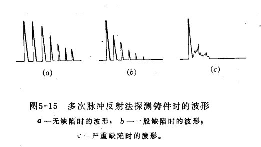 探傷鑄件的方法,通常采用多次脈沖反射法,有時也用一次脈沖反射法來確定缺陷位置。多次脈沖發射法是利用聲波在缺陷界面的反射和缺陷對聲波衰減的原理進行探測的。對于較厚且形狀簡單的工件,用此方法探測是比較適宜的。當工件內部無缺陷時,則出現鑄件底部的多次反射波,其波幅鑄件減小,并呈指數曲線衰減,如下圖a所示,當工件內部存在疏松等缺陷時,會造成聲波散射,使聲能衰減,則底波反射次數減少,如下圖b所示,當工件內部存在嚴重的缺陷,則底波消失或只有雜波,如下圖c所示。由工件底波的衰減狀態,即可判斷有無缺陷和嚴重程度。