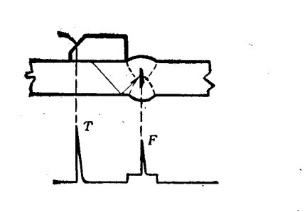 (二)四探頭法 四探頭法可探測厚度為4~12毫米的薄板對接焊縫中的裂紋、未焊透、條狀夾渣等缺陷。而且還可以進行探傷儀自動探測。四探頭法為兩組探頭(T為發(fā)射探頭,R為接收探頭),用機械固定并分別放在焊縫兩側(cè)(距焊縫軸線距離相等),探傷時沿焊縫同時移動。探測縱向缺陷時,T1R1為一組探頭,T2R2為一組當焊縫中無缺陷時,熒光屏上只出現(xiàn)焊角反射波。如有缺陷,則在焊角反射波之前出現(xiàn)缺陷波F(如缺陷在焊縫中間,則兩組探頭所得缺陷波重疊在一起),探頭移動時,缺陷波的幅度改變。