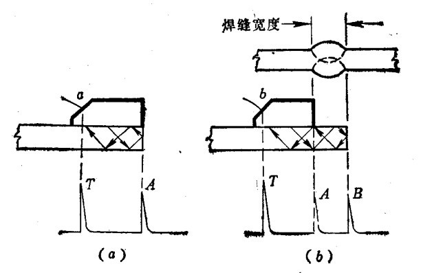 焊縫寬度法主要是利用橫波多次反射的探傷原理,來探測整個焊縫區(qū)域中的缺陷。探測時需在焊縫兩側(cè)進行,以免漏檢。將探頭放在工件厚度相同的試塊上,超聲波探傷儀探頭前沿和試塊前沿對齊,在熒光屏上得到極端反射波A,然后向后移動探頭,移動距離等于焊縫寬度,在熒光屏上又得到極端反射波B,并標出(用閘門波或機械刻度尺標出)A波與B波的位置,如圖所示