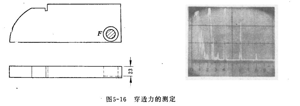 三、放大器線性的測定  如下圖所示,將超聲波探傷儀探頭放在F位置的有機玻璃塊上探測,有機玻璃的厚度相當于50毫米鋼的厚度。測定時,靈敏度的控制由最小開至最大,高穿透力儀器有6~10個反射波,低穿透力的儀器只有2~4個反射波。