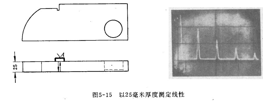二、時間基線(掃描線)線性的測定  用直探頭(縱波)測定,發射波調整在熒光屏的零點上。例如時間基線為0~100毫米時,將探頭放在試塊的A位置,以25毫米的多次反射波進行校正。微調掃描速度,使第一次反射波出現在25處,如果掃描線性好,第二、三、四次應分別與50、75、100刻度重合。否則多次反射波不成比例的出現在熒光屏上。