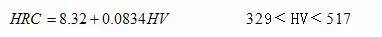 此公式用我國公布的黑色金屬硬度標準數據進行換算,其HRC誤差基本上在±0.4HRC 范圍內,其最大誤差也僅士0.9HRC,計算的HV誤差最大為±15HV。