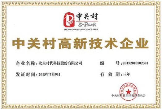 時代科技股份有限公司喜獲中關村高新技術企業(yè)認定證書