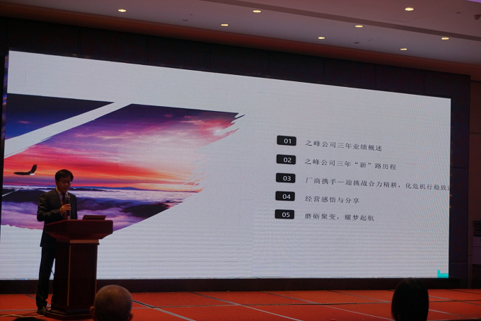 9點鐘大會正式開始,馬海龍總裁發表“合力謀發展,共贏創未來”的主題演講,講述著時代之峰公司不畏艱辛,勇登新高峰的篇章;介紹著三年的“新”路歷程,堅定不移的走不斷創新之路;堅持廠商攜手——迎挑戰合力勤耕,化危機行穩致遠的故事;述說著經營感悟與分享,與經銷商朋友分析經營的感悟與經驗;展望著磨礪聚焦,筑夢起航五個篇章。演講過程中大家紛紛額首,掌聲不斷。