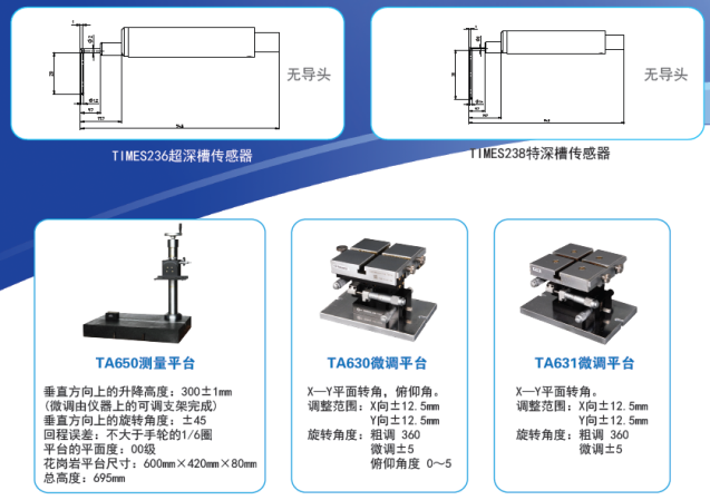 PC軟件、通訊電纜、TA650測量平臺(tái)、TA630微調(diào)平臺(tái)、TA631微調(diào)平臺(tái)、專用打印機(jī)、平臺(tái)支架、多種傳感器